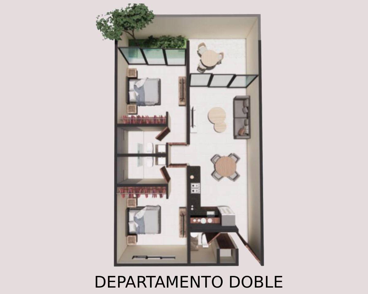 Centro Temozón es un desarrollo de departamentos de 1 y 2 habitaciones, inspirados en un estilo de vida campestre pensando en una experiencia comunitaria y la conexión con la naturaleza que diferencia a Temozón del resto de la ciudad. Ubicados a solo unos minutos de los mejores y más concurridos puntos al norte de la ciudad, además de contar con un fácil acceso a la carretera Mérida-Progreso. Este prototipo se caracteriza por tener estar distribuido en dos plantas, tener una dos habitaciones y doble altura en el área de la sala.
