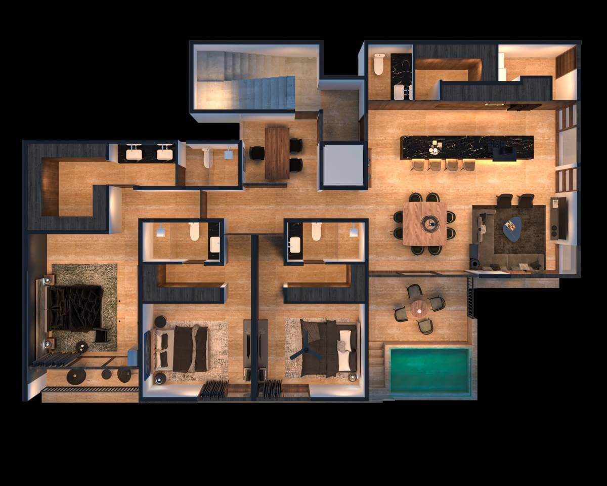 Hyde es un exclusivo concepto de solo 3 departamentos, diseñado en torno a la privacidad, el confort y un estilo de vida de primer nivel. Cada unidad cuenta con 3 a 4 recámaras y un elevador de acceso directo al departamento, ofreciendo una experiencia de residencia única y sofisticada.